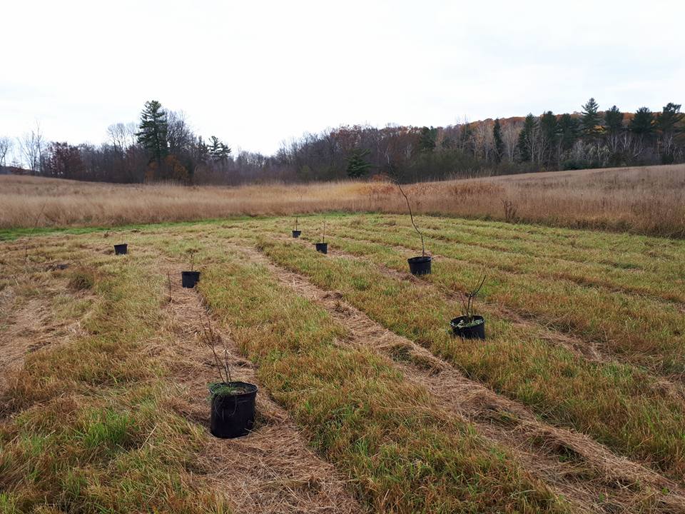 Now that the market season is over, it’s time to put the potted trees and shrubs away for the winter. We set the trees tightly together into trenches that are about the depth of the pots. Then, use leaf litter to cover the edges of the trenches and around the tree and shrub stems to insulate the roots from severe cold.