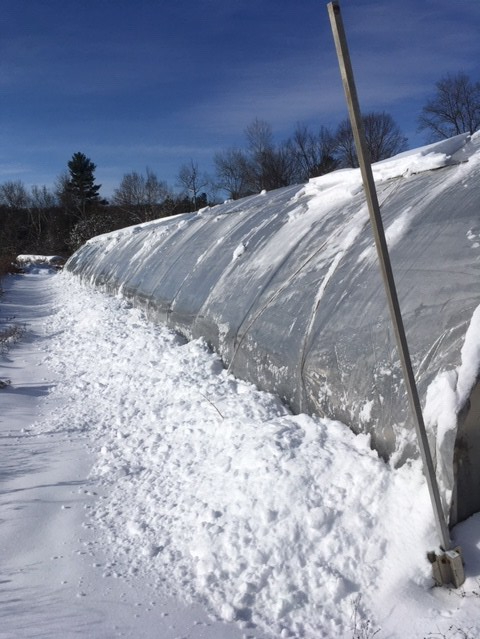 It’s not expensive to maintain a greenhouse like this once you have the cold frame structure, heating cable, wire hoops and frost blankets. We have hydrants in the greenhouse and hoses for watering. But, you rarely need to water during the winter because, inside the greenhouse, you have evaporation from the ground, condensation on the plastic, and precipitation back onto the ground. It’s like being in a closed terrarium.