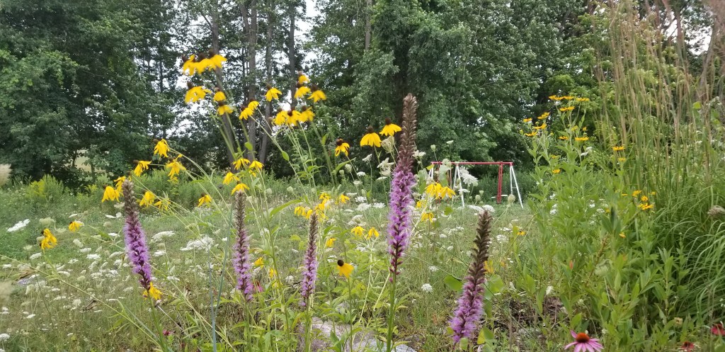We can reserve a small area in full sun for a mix of North American wildflowers and grasses that provide bloom from early spring well into fall. The small meadow area is not only beautiful in itself but becomes a haven providing food and shelter for fellow creatures.