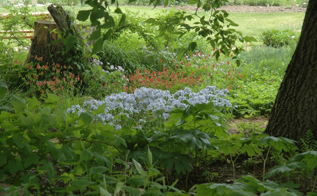 Rather than mow an area under mature deciduous trees, imagine woodland wildflowers, wood sedges and ferns that provide shelter to overwintering insects, tree frogs and toads. A log or two in the shaded area becomes a shelter for salamanders and invertebrates as well as provides a place where moss can thrive.